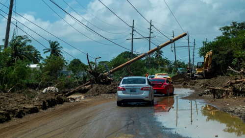 A line of cars navigating a partially flooded dirt road with fallen trees and damaged power lines. (Reuters.com, September 26, 2022, About 746,000 still without power in Puerto Rico after Hurricane Fiona).