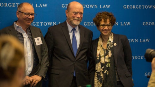 Professor Ugo Panizza of the Graduate Institute in Geneva, Georgetown Law Dean William M. Treanor, and Professor Anna Gelpern at "Debtcon," a conference co-sponsored by the Institute of International Economic Law, in April.