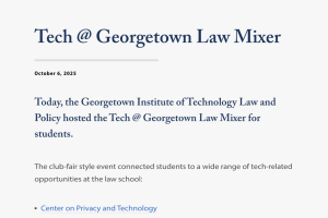 The Privacy Center tabled at the Georgetown Law Tech Mixer, which is an opportunity for organizations to showcase their work to students and see what others are working on at Georgetown.. The Privacy Center had a two staff members, Emerald Tse and Marianna Poyares, who spoke with 25-30 students about the Privacy Center's work and how to get involved. Some mentioned knowing about our work before arriving at Georgetown and others were eager for the chance to apply for our research assistant positions.