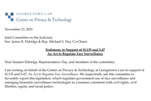 Associate Jameson Spivack submitted written testimony in support of S47/H135, An Act to Regulate Face Surveillance, to the Massachusetts Judiciary Committee. The bill, which would strengthen the state's existing face recognition regulation, builds on the work of grassroots Massachusetts organizations whom the Center has previously supported in pushing for face recognition legislation.