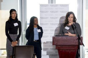 Postdoctoral Fritz Fellow Marianna Poyares and Fritz team members Ankita Sharma (B.S. Computer Science) and Dorea Marshall (J.D. Law) presented their research to the Georgetown community during Tech and Society week. Their research was on the ethical and legal implications of immigrant surveillance.