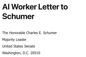 The Center signed onto a joint letter alongside 23 workers' rights, civil rights, and other civil society organizations calling on Senate Majority Leader Chuck Schumer to center workers and protect their rights in his efforts to address advances in artificial intelligence, such as through his "AI Insight Forum" series, which have to date featured a disproportionate concentration of industry representatives compared to civil society, civil rights, or workers' rights representatives. The letter presents several recommendations and calls on Senator Schumer and Congress to "develop a new generation of economic policies and labor rights to prevent corporations like Amazon from leveraging tech-driven worker exploitation into profit and outcompeting rivals by taking the low road".