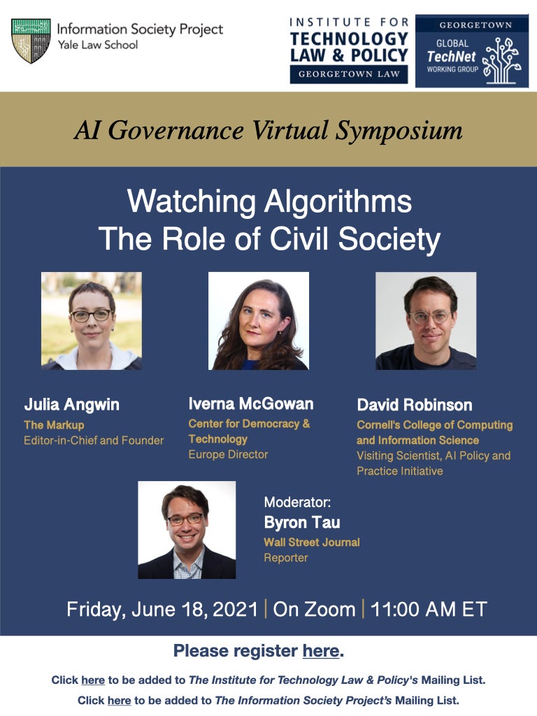 • Friday June 18 @ 11:00AM: Continuation of AI Governance Series hosted by Byron Tau of the Wall Street Journal. Join the discussion on “Watching Algorithms: The Role of Civil Society” with: Julia Angwin, Editor-in-Chief and Founder, The Markup; Iverna McGowan, Europe Director, Center for Democracy & Technology; and David Ronbinson, Visiting Scientist in the AI Policy and Practice Initiative, Cornell College of Computing and Information Science.  View the past registration details for the AI Governance Series hosted by Byron Tau